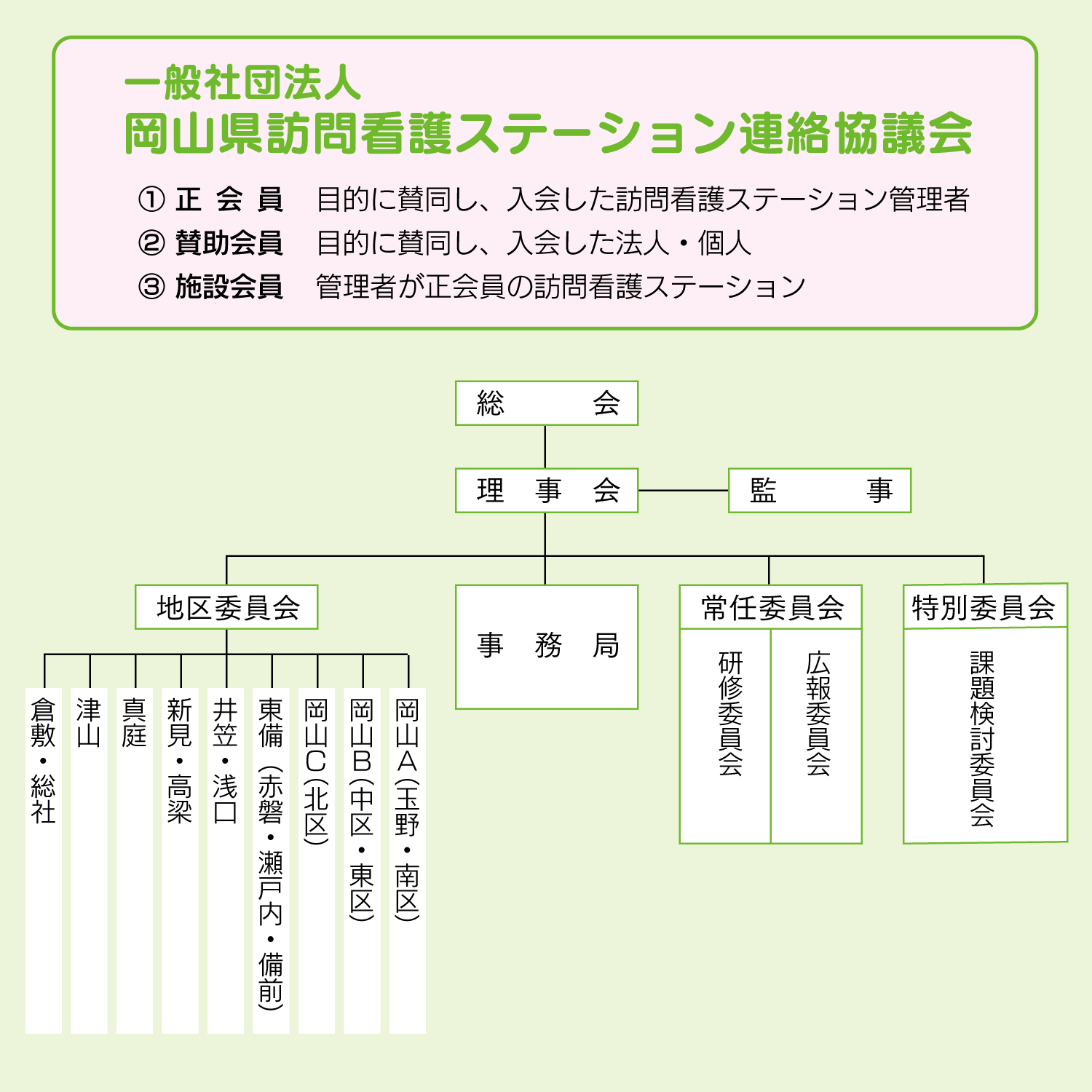 県内に設立されている指定訪問看護ステーションが、その機能を十分に発揮することができるように訪問看護の質の向上を図り、会員相互の研鑚と協力を助長し、もって岡山県における在宅ケア・サービスの推進に寄与することを目的とする。